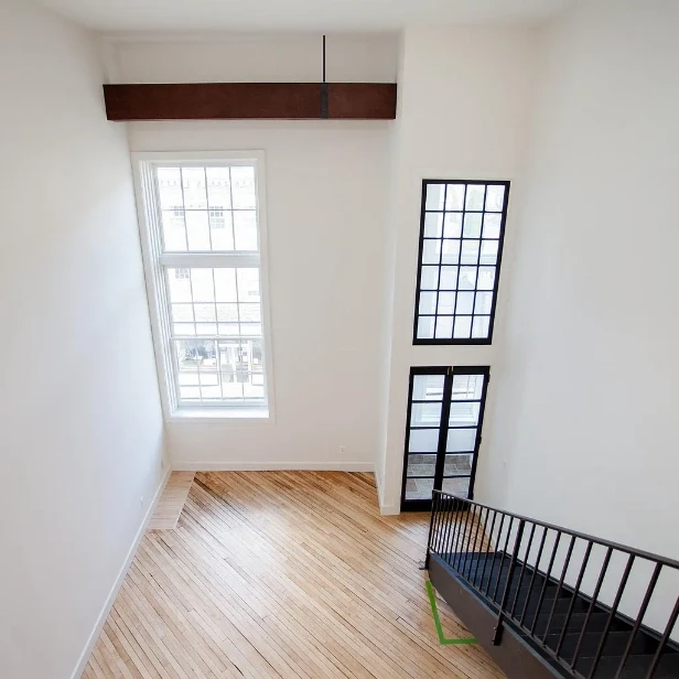 Nice fixtures. Likely difficult to heat and cool. With high walls, proper sound dampening is paramount or it’s a noise drum. Parking and laundry are a plus.