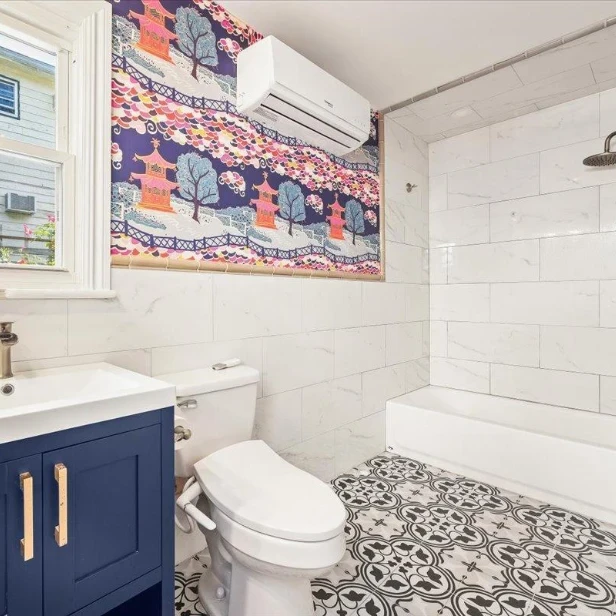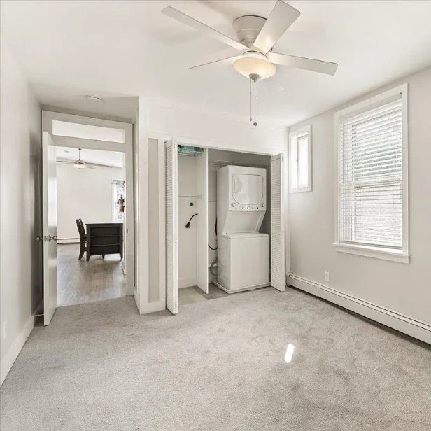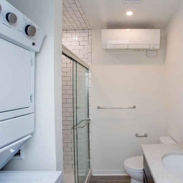 In-unit laundry, nice fixtures, and good light. Bathroom is through the bedroom.