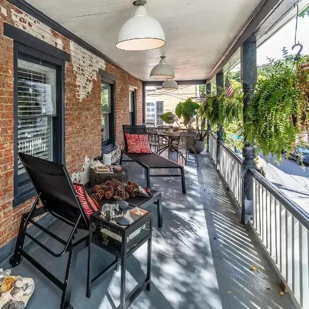 Beautiful industrial Style second floor apartment with a modern flare spans the entire footprint of the building. Welcomed by a covered spacious front entrance which leads to a big hallway, offering a coat closet and the rear door to the back parking lot with lots of space for bikes or additional furniture for storage. A grand stairway heads to the main level that won't disappoint! Renovated with high-end finishes and fixtures, stainless appliances, soapstone countertops, stainless hood above stove, open shelving & tile back-splash in kitchen, concrete tile, chic bathroom, corrugated metal wall detail in the office nook and repurposed vintage pieces add charm and character. The eat-in kitchen is spacious and fits a nice size table beside a big window. The open floor concept of the living/dining room is flooded with natural light. Enjoy entertaining and relaxing on the 35' long covered porch having exposed brick and overhead vintage lighting. Great location in the heart of town with off street parking , private washer & dryer & includes heat, sewer and hot water. Shared storage in the basement and exclusive attic storage. Rent includes heat!