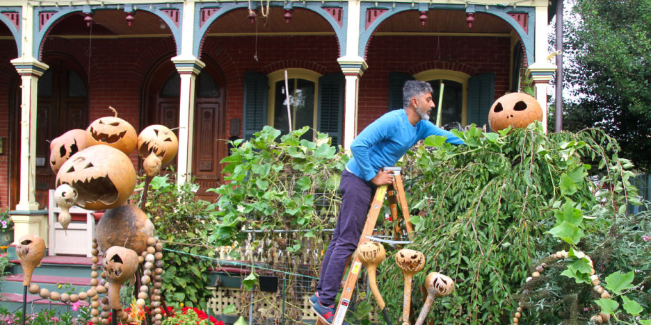 On Delaware Street between George and Main, there’s a more biodegradable kind of boogie man, built from a multitude of gourd varieties, including spinners, pears, and eggs as well as basketball gourds, tobacco box ones, and, of course, the calabash. It was this last kind of squash that first got Puneet Rao growing gourds back in 2012.