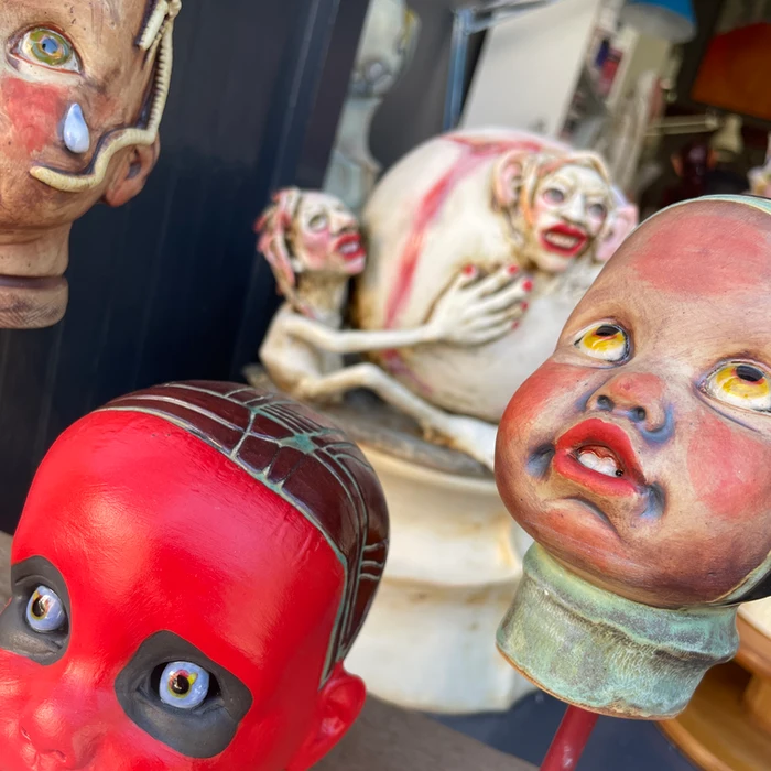 Of all her fearsome faces and figures, my favorites are probably her many iterations on the baby face. This repeated form is styled in a variety of ways, and that makes me eager to see where Winnie will go next with the chubby little cheeks and oversized forehead. The artist explains that somebody gave her a doll mold, allowing her to experiment with color and design without the fuss of building a sculpture from scratch. And that’s what the Halloween decorations are all about for Winnie: a low-key kind of mischief that opens up her creativity.